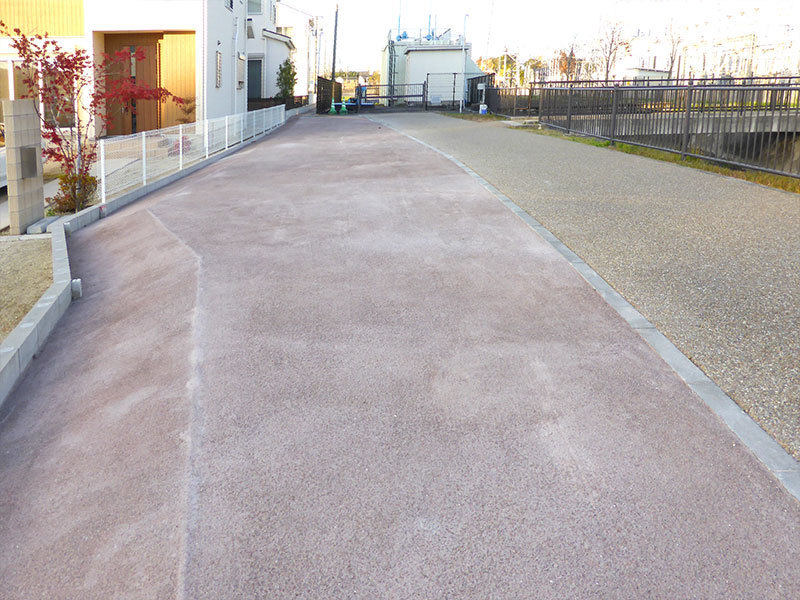 人が自由に出入りできる遊歩道は、散歩やウォーキングなどに多くの人の憩いの場として活用されています。土で舗装されていたため、凹みもできやすく、雨上がりには水溜まりもあちこちにみられました。『頑太郎®』で舗装したことで、適度なかたさになり、凹みも解消され、たくさんの方に利用していただいています。